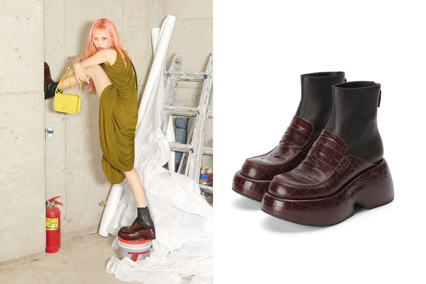 而獲邀成為 Loewe 全球品牌大使的韓國歌手泫雅,更率先示範這雙設計獨特的厚底樂福皮靴,染有一頭粉紅髮色的她,形象性感狂野,正好突顯出鞋子的強烈風格。