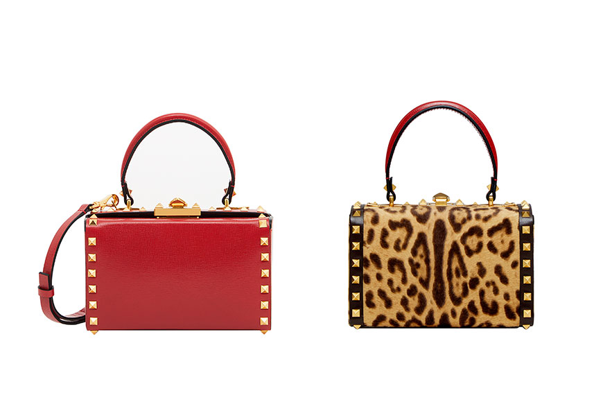 Valentino  Garavani Rockstud Alcove 箱型包以十字紋粒面皮革縫製,備有黑、紅及 animal print 印花款式;另外,還有一款搶眼奪目的全窩釘版本,盡顯品牌前衛型格的本色!