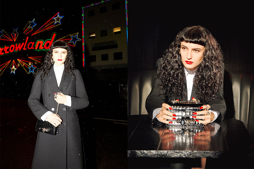 Sophie Muller 以黑白色彩風格貫穿整條短片,從中可見一頭復古大波浪髮型的 Lucia Fairfull,身穿稱身剪裁的西裝褸,塗上鮮紅美甲的她,手拿黑色鱷魚紋 Jewelled Satchel 手袋出鏡,造型時尚又具霸氣。