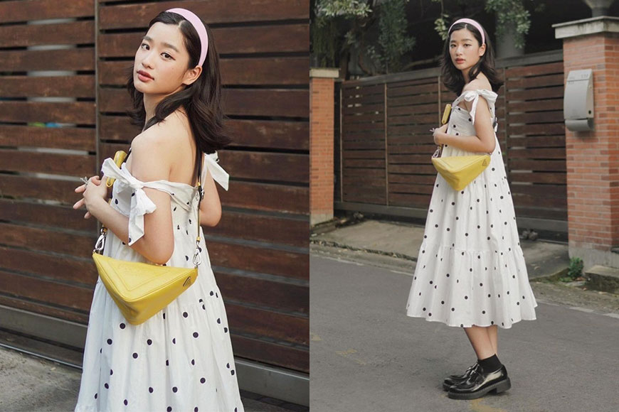 在泰國版《流星花園》飾演杉菜一角的女星 Tontawan Tantivejakul,形象青春可愛,身穿露肩黑白波點娃娃連身裙的她,以黃色 Triangle Bag 襯托造型,為造型注入活潑色彩。