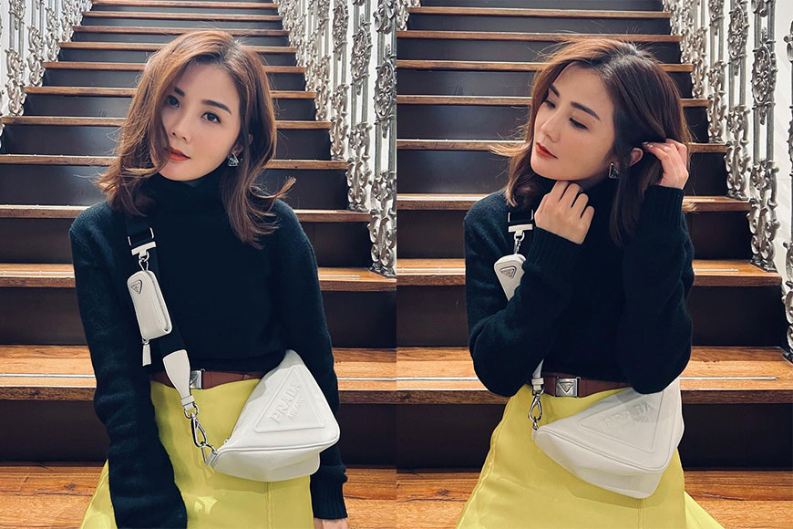 身穿鮮黃裙子配黑色上衣的阿Sa,選來白色斜孭款式作配搭,一身打扮相當sharp醒!