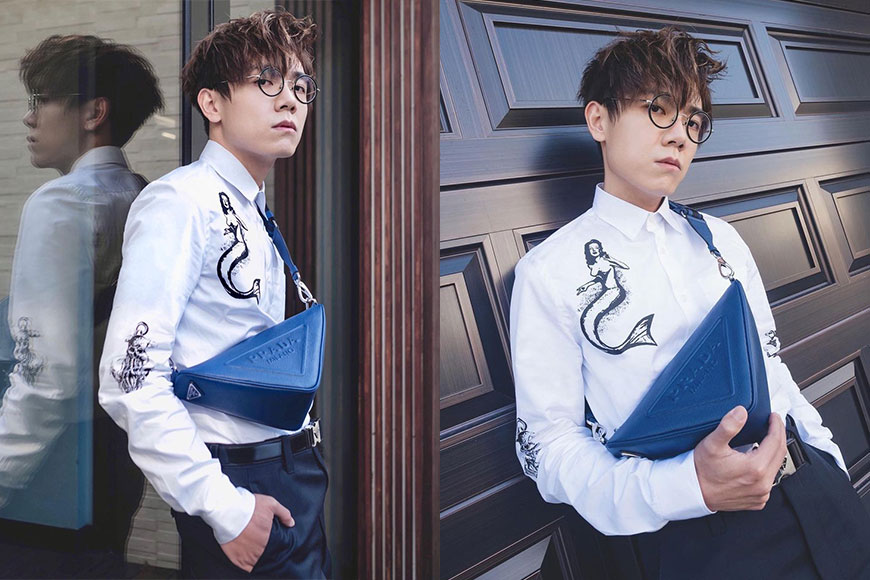 林家謙向來予人文質彬彬的感覺,身穿白裇衫、黑西褲的他,把藍色 Triangle Bag 斜孭上身,為整體造型注入時尚氣息。