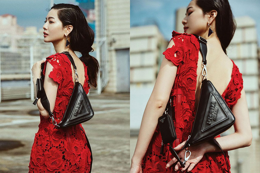 泰國女星 Kao(Supassara Thanachart)身穿 Prada 鮮紅色連身短褲,配以白色版本,營造出強烈鮮明視效;而手袋亦同時呼應她佩戴的 triangle logo 耳環。