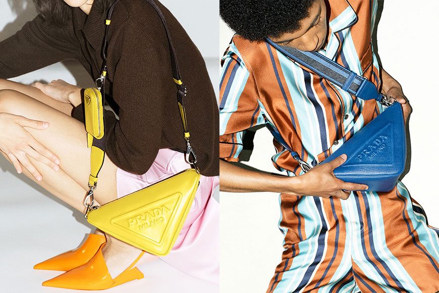 手袋造型如同立體的三角形標誌,其精巧工整的輪廓,呈現 Prada 對簡約主義的追求。 設計以鮮明奪目的色調配襯同色系細節,附有可自由調校及可拆除尼龍肩帶,可用作手提袋或掛肩袋。三角形袋身亦不失實用性,採用寬闊的袋口設計之餘,更配備可拆除的索繩小型袋子,讓袋中的物品保持井然有序。