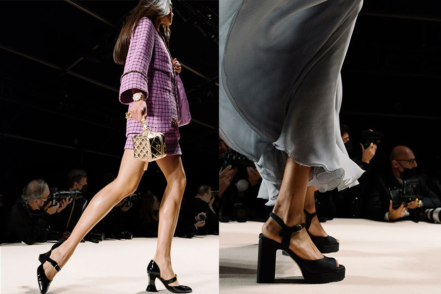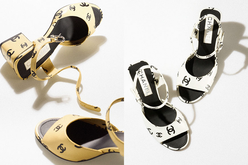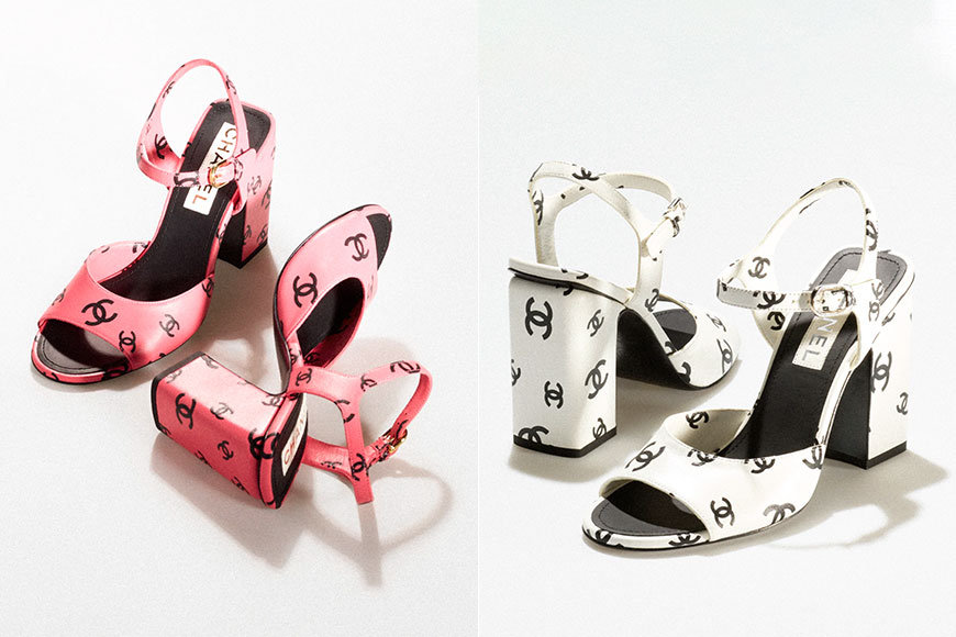 為呼應這股甜美形象,Virginie Viard 更特別設計了一款「雙 C」logo 印花粗踭高跟涼鞋配搭造型,展現出 CHANEL 女生俏麗活潑的一面。
