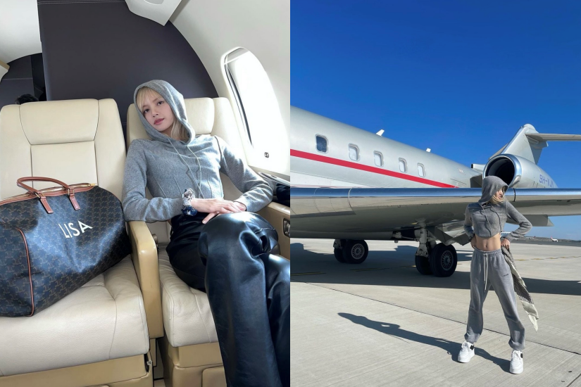 乘坐品牌安排專機到巴黎的 Lisa,上機時穿上了短版灰色有帽針織上衣與黑色皮革長褲,短身設計的上衣秀出纖腰與腹肌,搭配了 CELINE 鍊帶黑色手袋,另外還有印上她名字的專屬 Triomphe 印花帆布旅行袋,簡單隨性卻時尚。