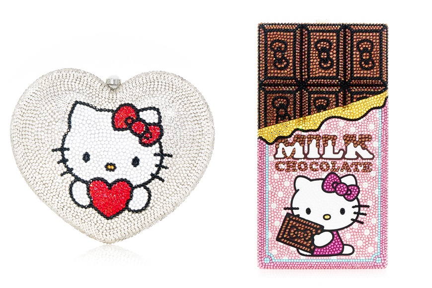 除此以外,系列亦包括 Hello Kitty 主題的設計,像是紅色和粉紅色蝴蝶結的 Kitty,或是在朱古力包裝紙上的 Kitty。每個手袋均採用華麗精緻的工藝製成再鑲滿水晶,所有細節都是象徵 Judith Leiber的標誌。