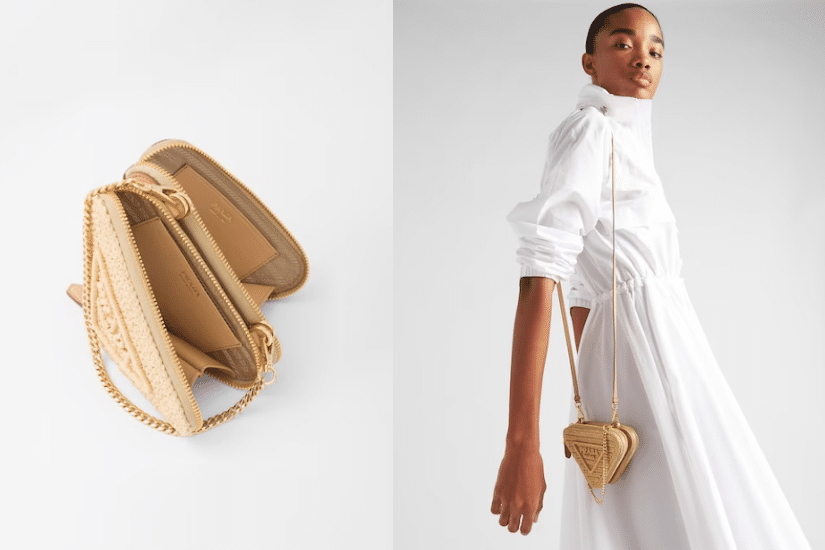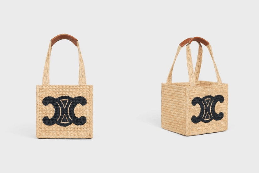 Celine 的織籃手袋飾上皮革 Triomphe 標誌與手挽,為袋款添上奢華質感,粉紅色的細節,顯得俏皮又少女感十足 ! 另一款拉菲草手袋,如骰子般的正方型設計,別緻又時尚。
