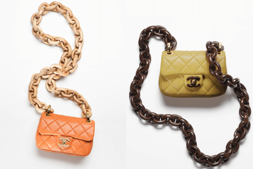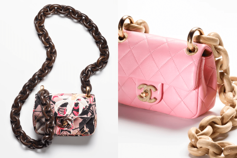這款迷你 Flap Bag ,袋身雖然小巧,但 11 × 18 cm 的尺寸絕對足夠應付日常需要,呼應系列主題用上溫暖的色調,備有橙色、綠色、黃色、粉色、印花布料等多個配色選擇,最大亮點落在袋身配備的飾粗鏈帶,由雞翅木或白蠟木打造,垂蓋的雙 C logo 也換上木材,令整個手袋呈現趣味感。