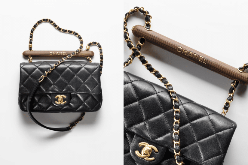 另一款細號 Flap Bag 為經典款式帶來新詮釋,於金屬皮穿鏈帶之間加上橫向的木質手柄,並飾上金屬 logo ,為手袋注入高級質感,無論手挽,還是斜揹或側揹,都令造型瞬間多了一份時尚的獨特氣息。