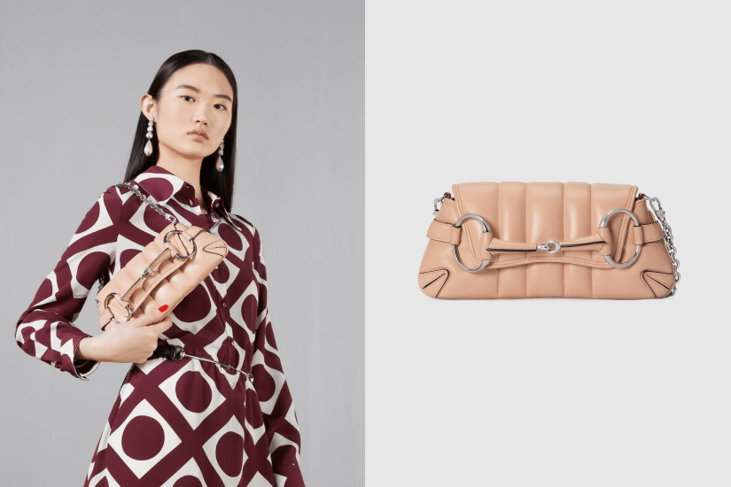 Horsebit Bag 於 2000 年首度推出便大受歡迎, 2023 秋冬採用不同色調和材質重新演繹,並將 Gucci 的重要元素馬銜扣放大,帶來前衛又型格的 Horsebit Chain Shoulder Bag。