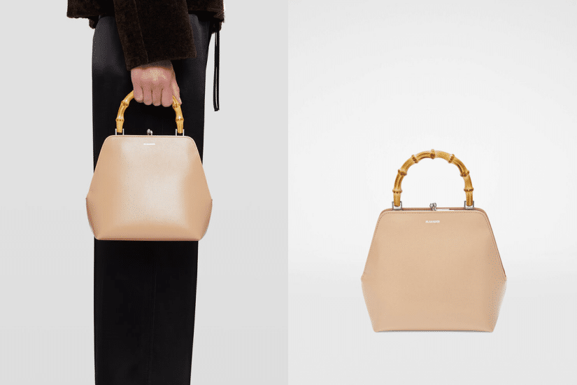 Jil Sander 的手袋最適合愛簡約的女生,這款皮革打造的手提包,口金包設計配上如枸杞的金屬細節,加上竹手柄,低調卻滿滿質感與節感。