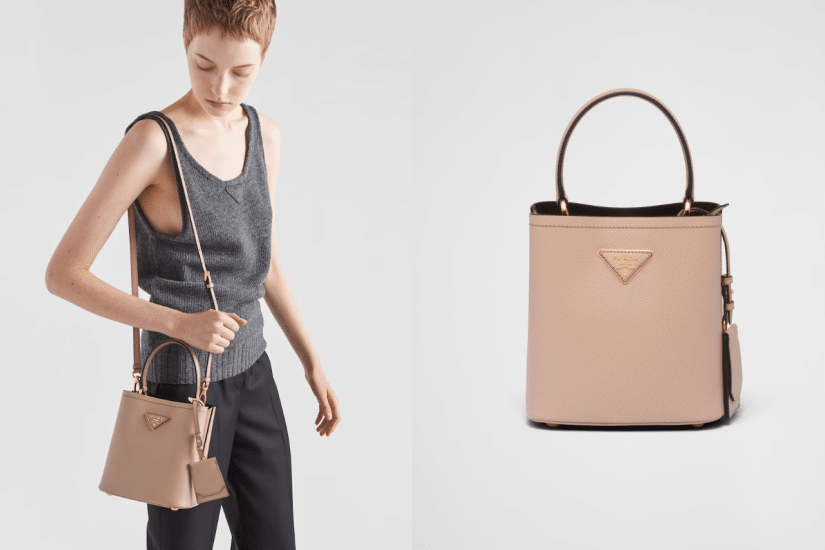 Prada Double手袋呈現 Saffiano 皮革的經典質感。單手柄手袋的設計採用獨特的袋頂飾帶開合,配上這個溫柔的色調更顯優雅。