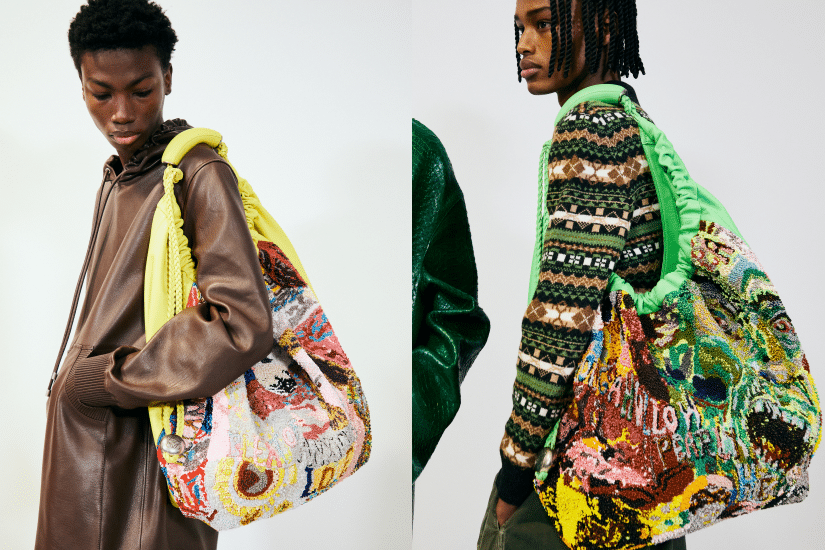 在最新的 2024 秋冬男裝系列中,可以看到更大版本的 Squeeze 手袋,最適合近季的大手袋潮流。藝術家 Richard Hawkins 將其獨特美學融入時裝騷場地及系列的設計概念中,亦延伸至袋款設計,他的作品被轉化為零碎片段,再經過拼貼組合,變成了印花、提花織圖案、刺繡,令手袋變成了藝術品一般,另外也有牛仔布版本,為本來優雅的手袋,增添隨性時尚,而原來的甜甜圈金屬揹鏈亦變成了粗繩索,不止是男生,即使女生揹上身時尚個性同樣立即提升。