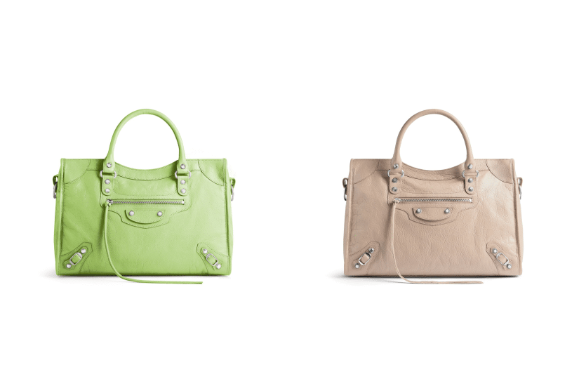 全新的 Balenciaga Le City 手袋分別推出了中號和小號款式,備有多款配色選擇,包括黑色、白色、杏色,以及搶眼青綠色、黃色等,並配有肩帶,令使用方式更靈活多變。