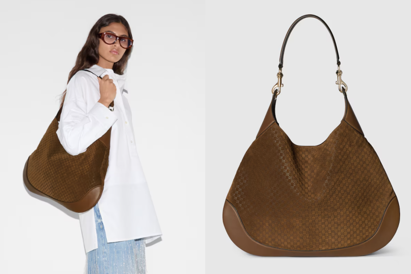 Gucci 推出的全新 Gucci B 手袋,其設計靈感來自 1950 年代的典藏風格,設計歷史可追溯自二十世紀中期。這款肩揹袋採用麂皮打造,壓印的 GG logo 低調地呈現細膩質感,袋身隨使用者揹上身,呈自然垂墜的曲線,不經意地流露出一種瀟灑的時尚魅力。