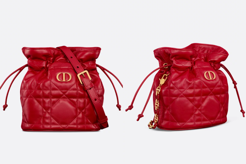 水桶袋是不敗的經典袋款,這款來自 Dior Caro 系列的迷你束繩水桶袋,以石榴石紅色羊皮製成,配以大型藤格紋圖案縫線及正面 CD 標誌,手袋的鏈式肩帶上交替的復古金色飾面金屬鏈環和同色系搪瓷鏈環與皮革互相映襯,可調校鏈帶同時附有皮革鑲片,令手提、肩背或斜孭時更為舒適。