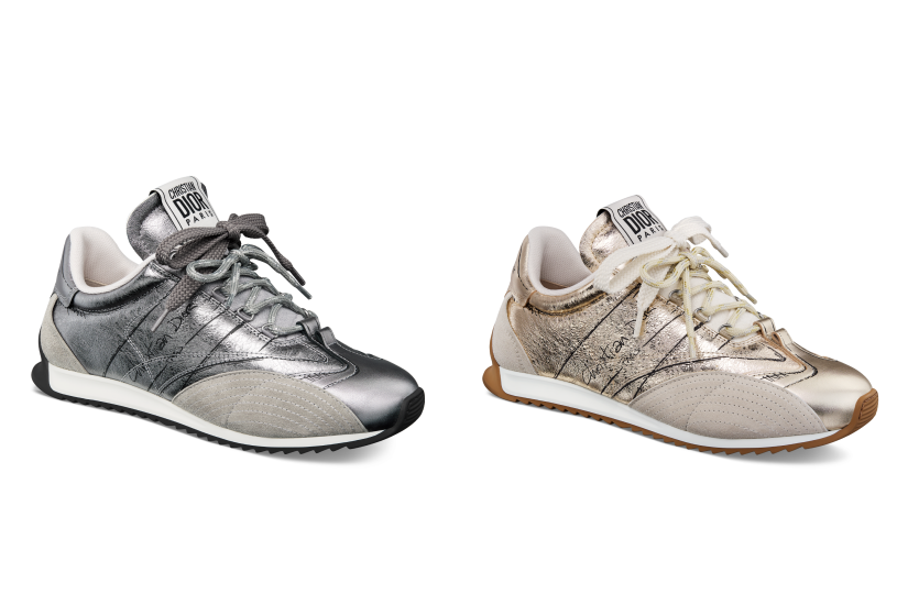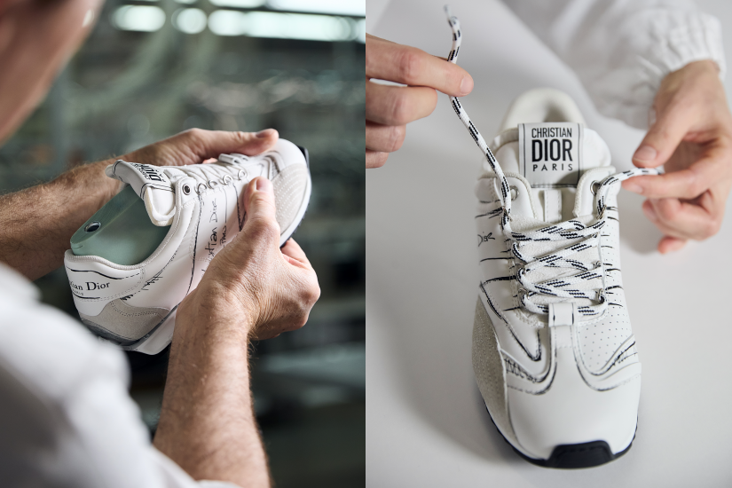 由 Dior 女裝創意總監 Maria Grazia Chiuri 設計的全新 D-Sketch 運動鞋,展現經典復古美學,最特別之處是鞋面飾有構思期間的草圖鉛筆標記,展現「製作中」的概念。這些獨一無二的圖案其後以手工精心複製,再以絲網印刷將尺寸調整至完美。「Christian Dior」的名字則以手寫字體刻在側面,散發原型的魅力,向 Dior 先生所珍重的細節藝術致敬。而為了突顯大膽效果,縫線並非總是平行的,而是透過工匠的精準調節獲得微妙的不對稱效果。穿孔皮革極致輕盈,而軟墊內層則令穿著時加倍舒適。