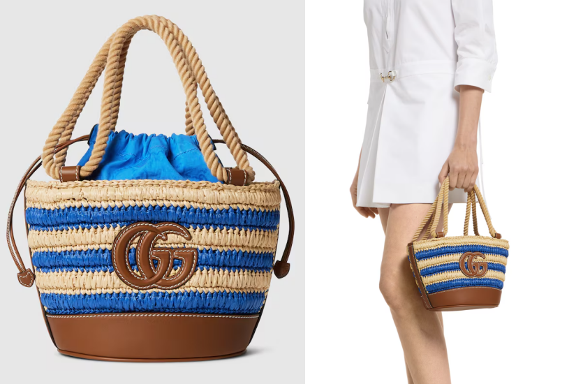 這款 Gucci 手袋款呈現獨特的拉菲草細節,藍色和自然色的拉菲草打造出條紋效果,與光滑的皮革飾邊碰撞,鮮明搶眼,適合不同的夏日風格的造型!