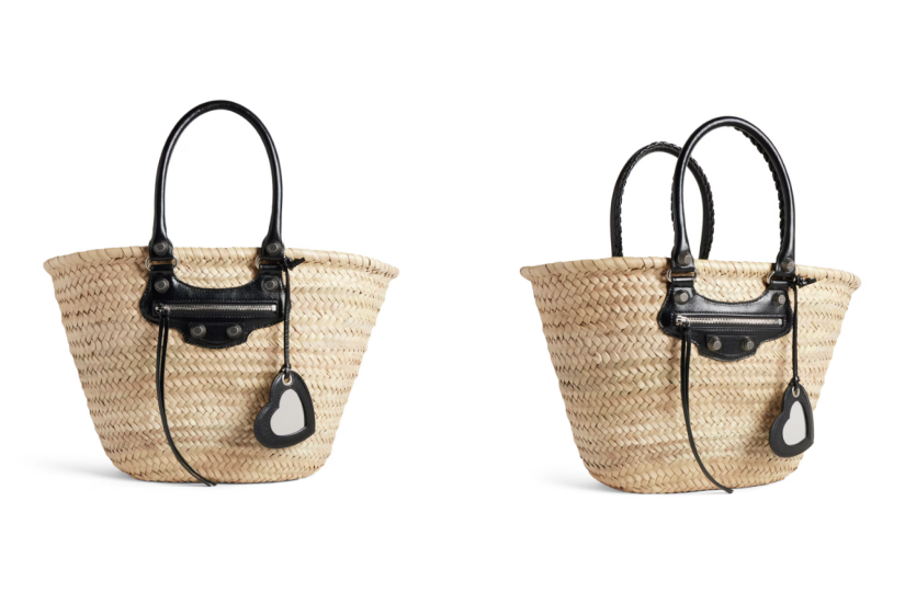 Balenciaga 為人氣 Le Cagole 手袋推出編織籃子版本,採用米色手工編織棕櫚樹葉搭配黑色小羊皮手挽,以及標誌性的金屬配件與拉鍊口袋,加上可拆除的心形鏡子掛飾,顯得型格又帶點俏皮,最適合充滿個性的時尚女生。
