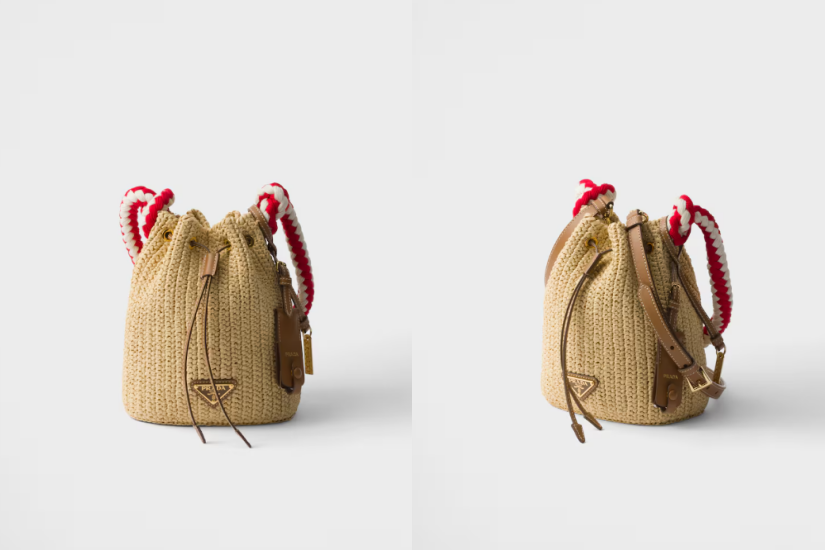 Prada 這款鉤織迷你水桶袋,袋仔細細卻容量十足,絕對足夠收納日常隨身物。紅、白配乙棉繩手挽營造出對比效果,更添搶眼細節,而皮革細節則為手袋添上夏日氣息。