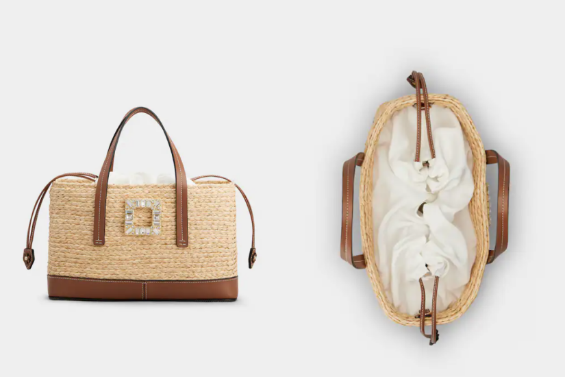 這款 Roger Vivier Viv’ Skate 手袋,以拉菲草拼接皮革製成,配有可拆卸提把和肩帶,點綴標誌性的水鑽飾扣,兼具都會時尚與 Roger Vivier 優雅風情。