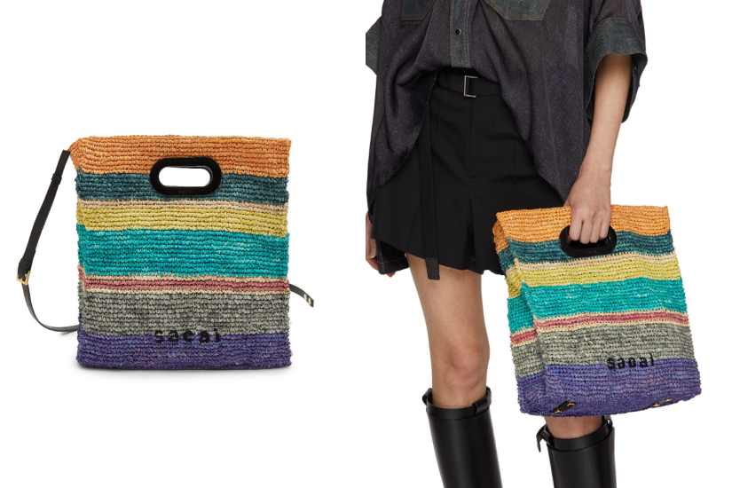 SACAI 的俏皮風格在這款拉菲草手袋中得到了充分體現,採用充滿活力的夏季色調,營造出撞色條紋效果,配有黑色手挽和可調節的皮革肩帶,不論海邊度假和城市都會風格都可以 perfect match。