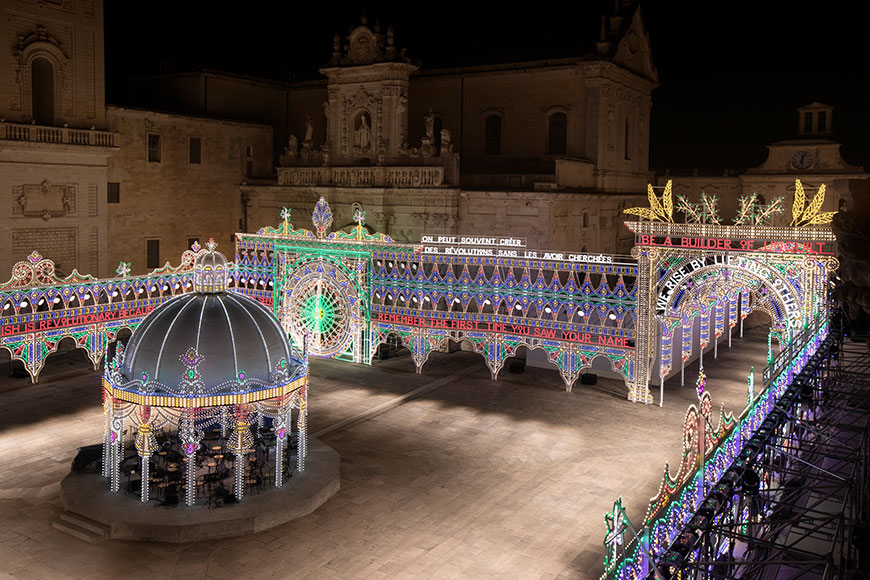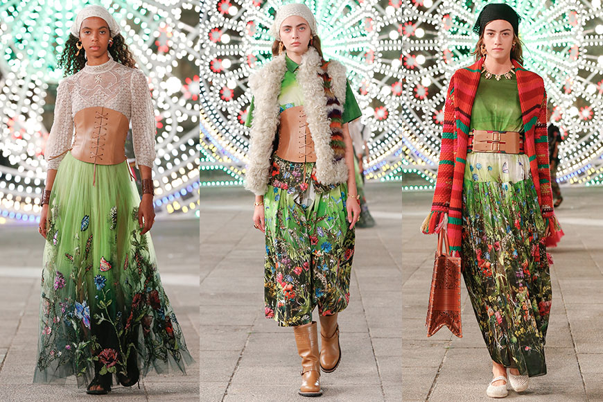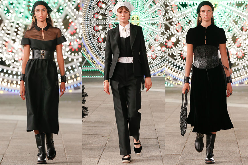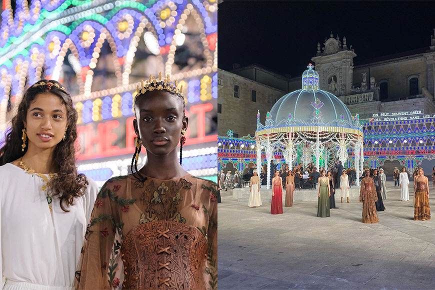 Maria Grazia Chiuri 把這場 Dior 2021 早春度假系列發布會搬到意大利南部城市 Lecce 的 Piazza del Duomo 內,並請來藝術家 Marinella Senatore 以 3 萬粒 LED 燈泡把廣場點亮成一個黑夜中發光發亮的夢幻國度。為了把氣氛提升,更請來音樂家、交響樂團和舞蹈家現場表演,營造絢麗又帶點神秘的氣氛。