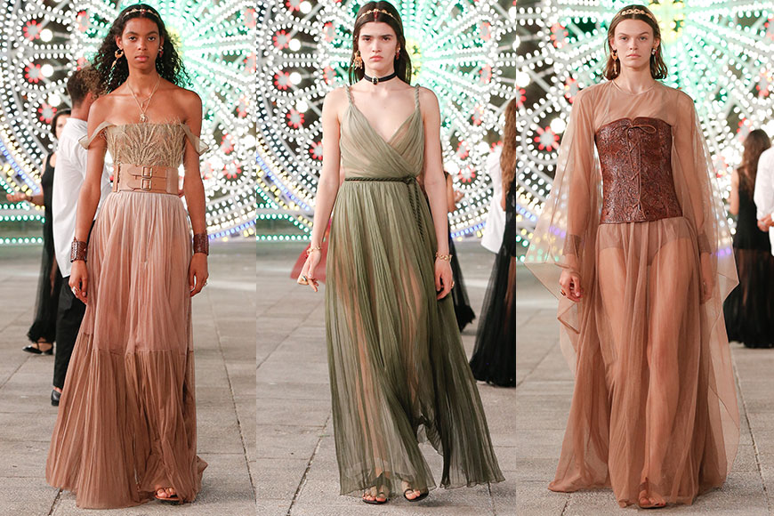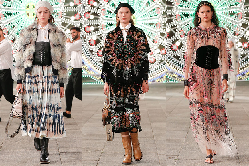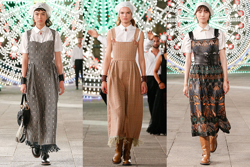 一套套充滿異國風情的服裝,當中包括:流蘇細節的印花紗裙、圍裙式連身裙、皮革寬腰帶搭配復古感的白色連身裙等等,模特們更戴上頭巾及平底長靴,為仙氣滿滿的裙子帶來舒適日常感。