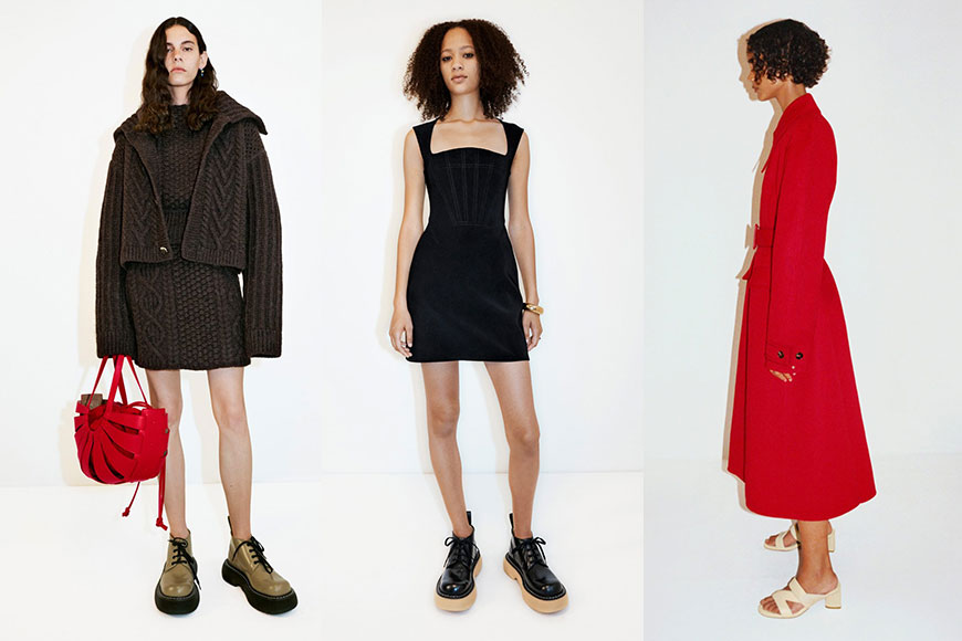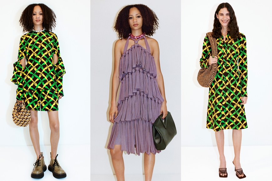 或許你會覺得上述所提及的單品難以駕馭,那也無須擔心,因為系列其他的服裝仍然保留了 Daniel Lee 鍾情的女裝簡潔的輪廊,綴有流蘇裙擺的針織套裝、修身的削肩連身裙,富有流線感的大衣都突顯出精簡俐落的設計風格。除此之外,系列亦不乏有趣的設計元素,例如連身裙上滿滿的綁結細節及人體圖案印花,都為整個系列添上別樣新鮮感。