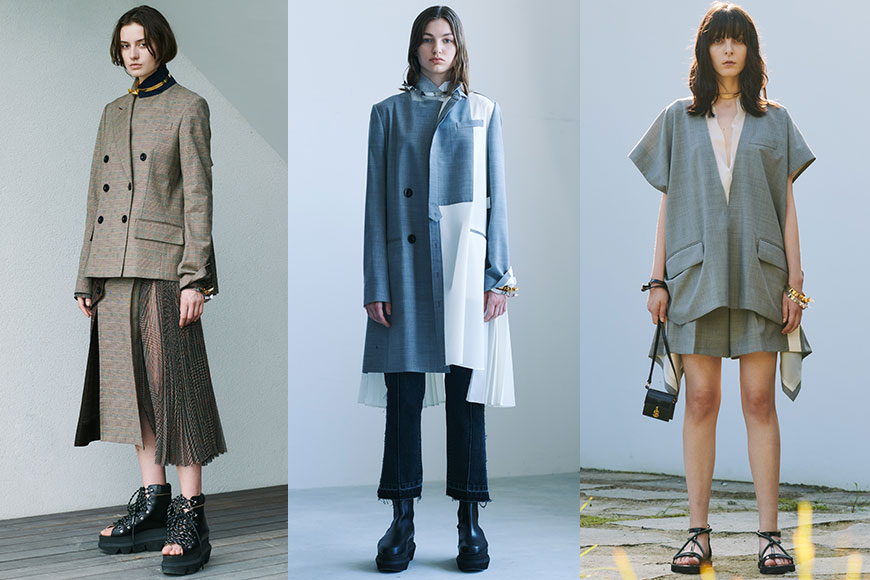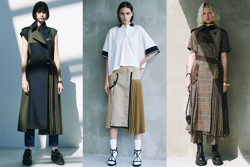 女裝系列中也常見不同物料的拼配,牛仔外套、針織毛衣、西裝外套等本來各不相干的單品,在阿部千登勢的巧妙安排下結合,再加上她的拿手戲碼百褶與雪紡,拼接出一件又一件熟悉卻相當有新鮮感的新設計。