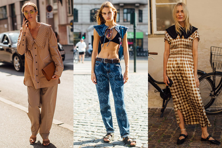 介紹完主流色彩之後,是時候把目光轉移至服裝細節之上。一向不喜歡過多複雜元素的北歐 fashionista,今季愛上以娃娃衣領點綴整個造型。娃娃衣領不但能為幹練的恤衫增加俏皮可愛感,也可平衡格仔連身裙過於雜碎的視覺效果。而單穿娃娃衣領點綴 bra top 配牛仔褲的造型,完全刷新性感定義。