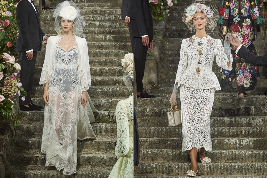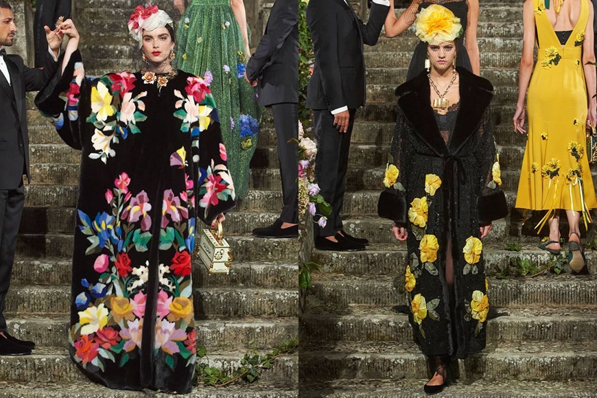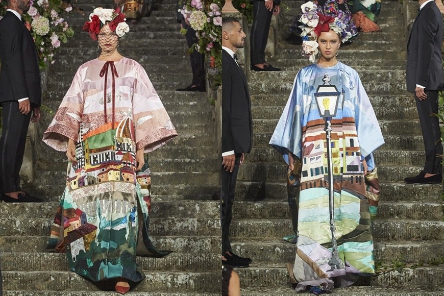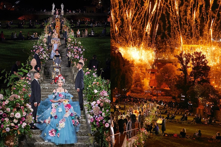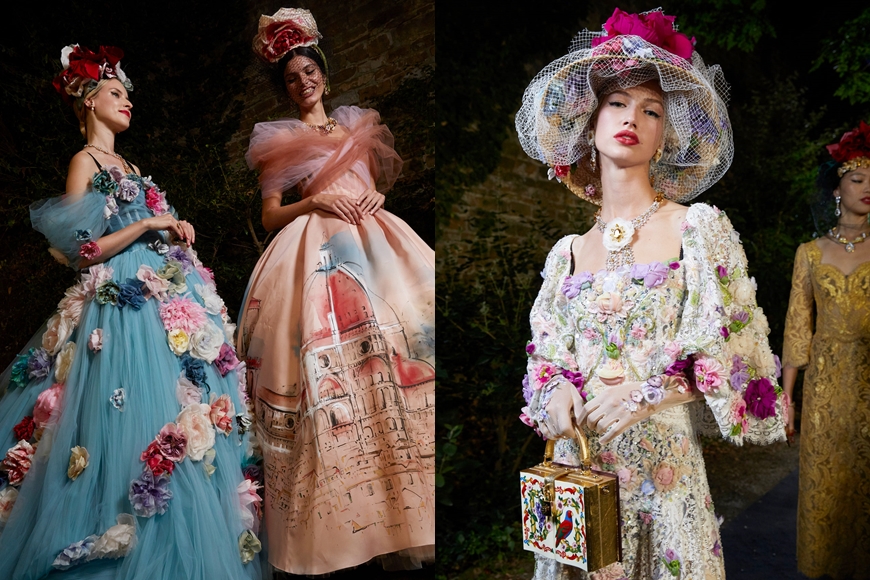 在跟足政府嚴格衛生防控措施的情況下, Dolce & Gabbana 把大秀移師到象徵著文藝復興時代的佛羅倫斯舉行,並選址在 Villa Bardini 別墅中的花園,率先以如此壯麗豪華的環境來震懾大家的眼球。伴隨著由義大利作曲家 Nino Rota 所編著的既夢幻且輕快的配樂,模特兒沿著以花卉裝飾點綴的石級階梯緩緩步下,展示出 89 套令人驚艷絕倫、完美呈現出義大利傳統工藝的高訂作。