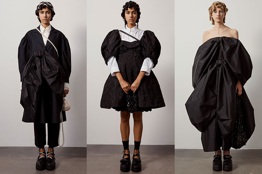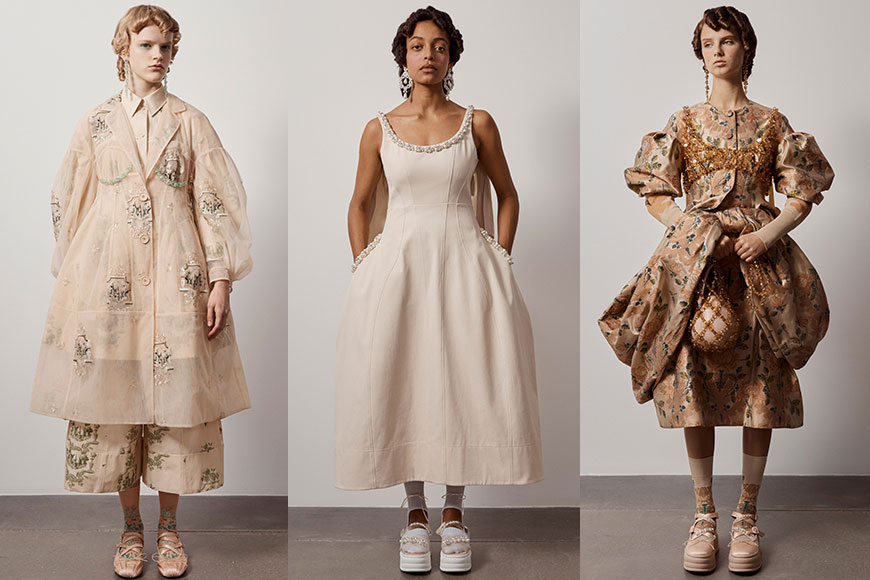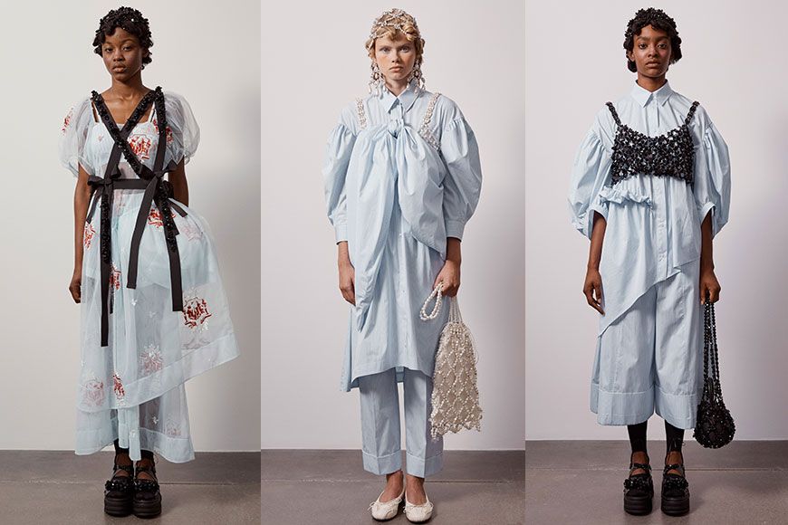Simone Rocha 今季以洛可可風格為主軸,為大家帶來一系列夢幻有帶點古典感覺的設計,令模特兒有如從洛可可時期油畫走出現實的少女一樣。設計師繼續把珍珠元素發揚光大,無論是服裝細節、配飾及手袋都加入大量的珍珠及珍珠貝母元素,優雅且華麗。