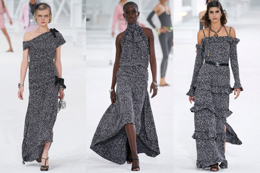 發布會一開場,Virginie 帶來幾套黑白碎花長裙,不論是斜肩、入膊或者露肩的設計都加入蝴蝶結及荷葉邊的細節,整體感覺溫柔高雅,為系列打開討喜的序幕。