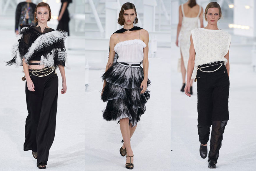 除了穿搭度滿分的 T 恤之外,CHANEL 的 2021 春夏系列當然也有大量氣質優雅高貴的設計。粉紅及奶油色的背心套裝,造功細緻的通花蕾絲裙,以及加入輕盈柔軟羽毛元素的經典黑白設計,就如把法國電影中的優雅柔美、知性灑脫的女主角完美呈現!