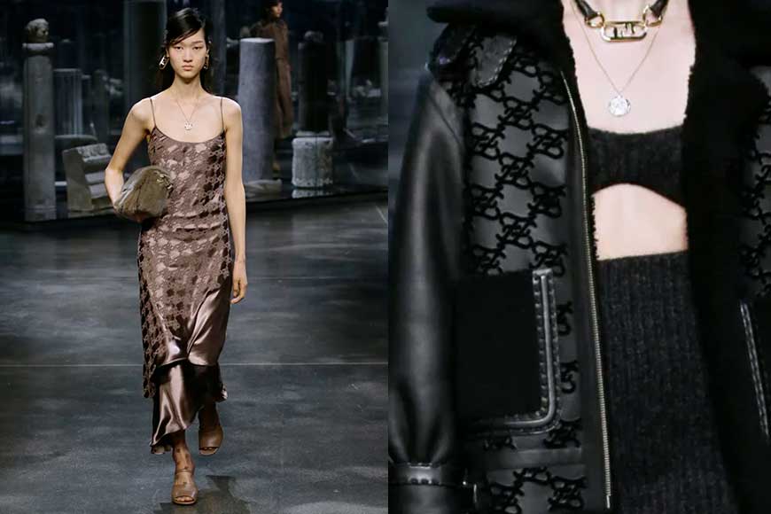 Karligraphy 這是 Karl Lagerfeld 時期為 FENDI 留下的寶貴遺產。「雙 F」圖形環抱纏繞,充滿復古和文藝氣息。Karligraphy 圖案在 Kim Jones 的手上,以刺繡、印花的方式出現在襯衫、連衣裙、絲襪上,致敬之餘也訴說著品牌經典。