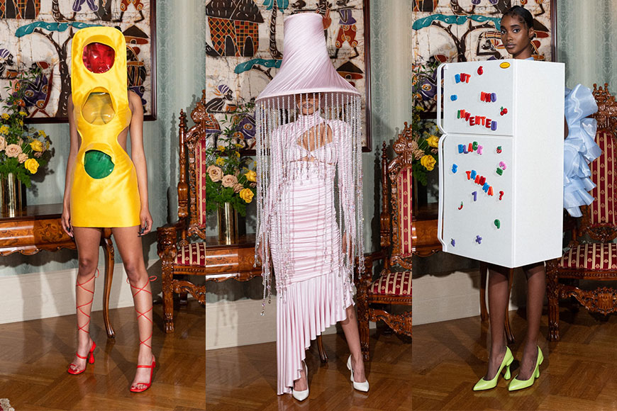 系列的每一套服飾都充滿話題,不過外型就與大家認知中的高訂服裝絕太一樣,從中可見從頭上拖到地的「髮捲」造型,視覺上相當壯觀,從模特兒吃力的步伐,也能感受到物料的重量;還有超搶眼的柱狀「紅綠燈」、體積龐大的「花生醬」,以及於緊身衣外罩上的「防火梯」造型。Pyer Moss 的高訂會成為女星踏紅毯的戰衣嗎?也許只有 Katy Perry 才能駕馭!