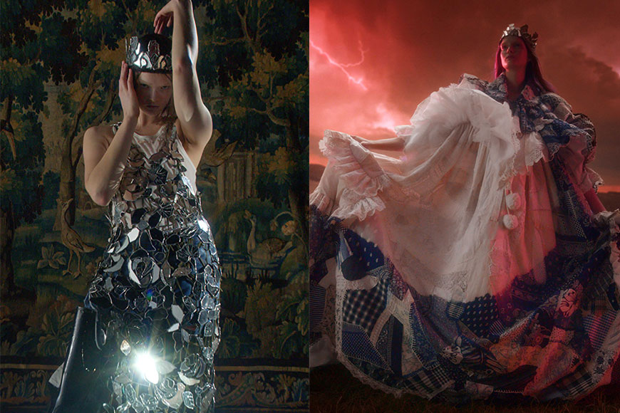 另外,John Galliano 亦透過石洗方式,將原本奢華美麗的料子褪成晦暗色調。在片中一片紫紅色火燒雲的襯托下,一系列經過精心折磨的解構高訂服飾,都流露出暗黑詭異的浪漫美學。