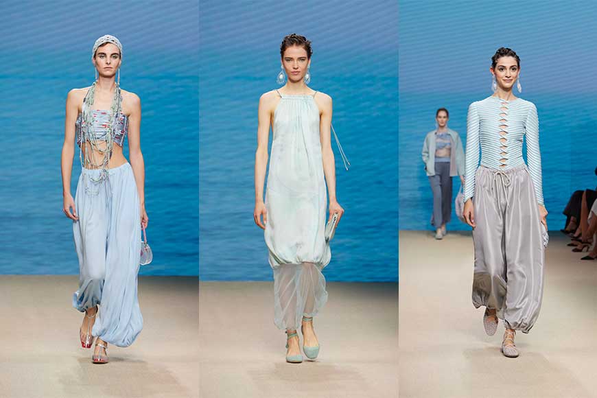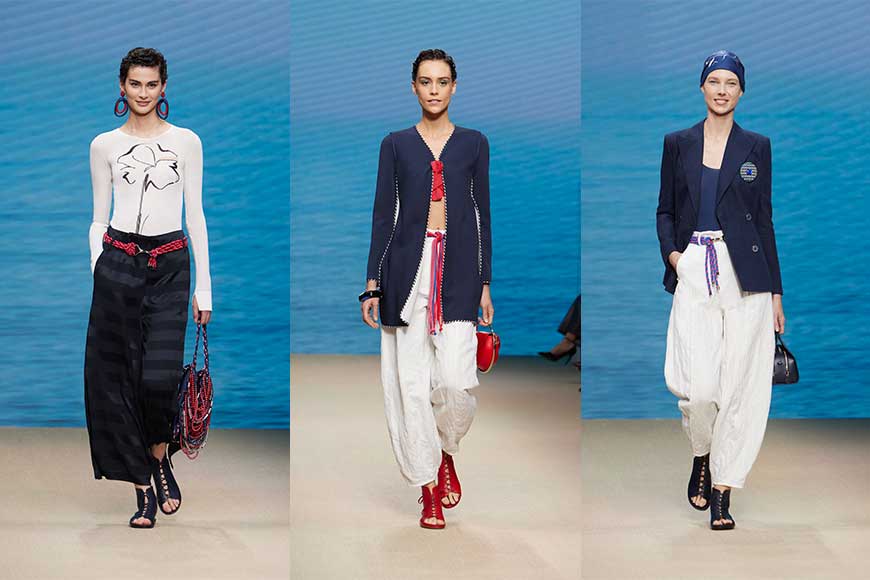 品牌形容今季的設計是一場 comeback,糅合 Giorgio Armani 的都市風格與游牧民族氣息;開場造型以深藍色和白色為主調,並加入紅色配飾及細節點綴,模特兒頭戴絲巾,腳踏繫帶涼鞋,優雅中流露愜意。
