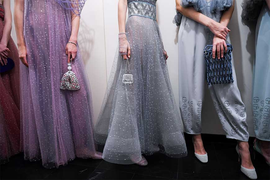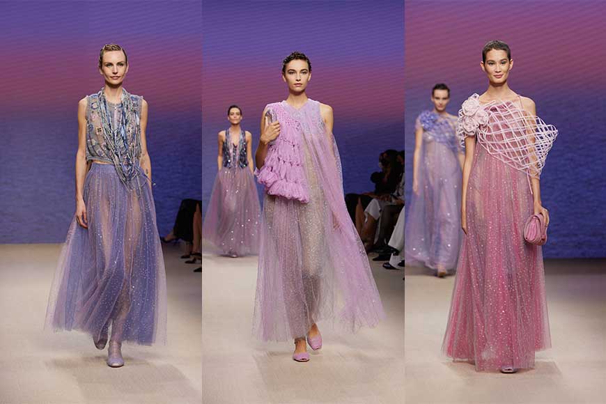 至於品牌拿手的晚裝則以多層薄紗堆疊,閃爍刺繡薄紗裙襬,閃閃發光,配以甜美柔和的色彩,嬌美動人。
