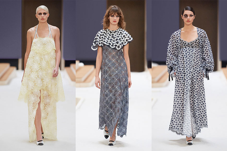 CHANEL 高訂系列的壓軸婚紗造型一直都是大秀亮點,瑞士超模 Vivienne Rohner 身穿潔白簡約婚紗,拋棄沉重的頭紗,戴上了山茶花裝飾的髮箍,手捧藍色山茶花束登場。