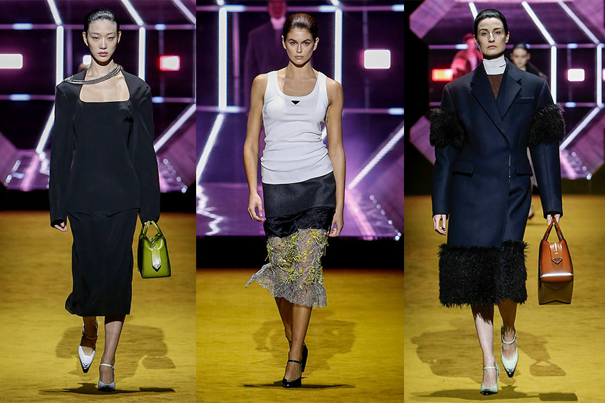另外,今季亦特別請來「跨世代」名模陣容行騷,天橋上除了可見 Kaia Gerber、Sora Choi 等新世代模特兒外,同場還有 20多年前曾為 Prada 走騷的模特兒們,包括:Erin O’ Connor、Liya Kebede、Elise Crombez 和 等,她們一同梳起 all back 髮型,展示出不同年齡層女性獨立、自信的形象。