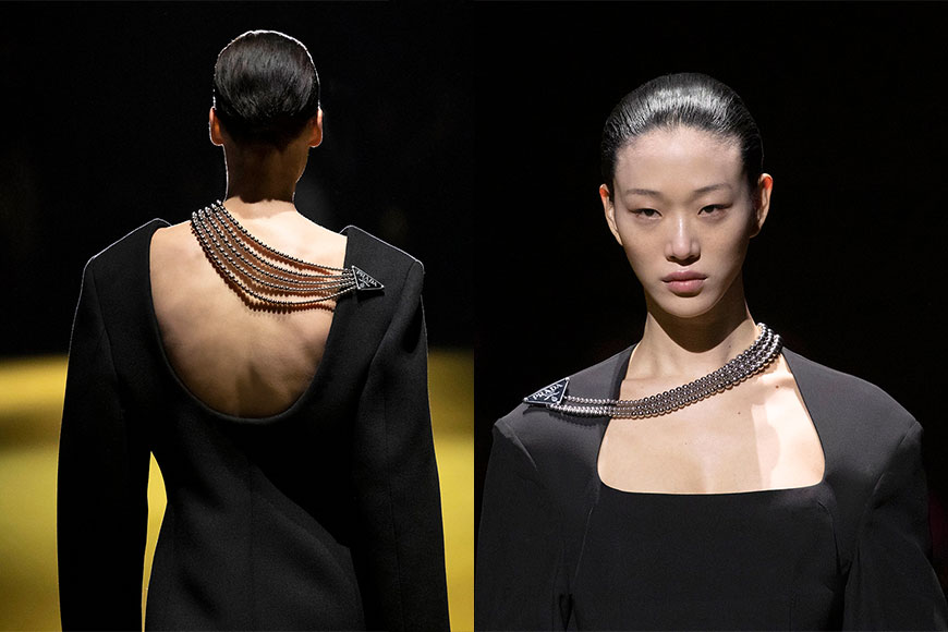 配飾細節方面,就不得不提品牌的倒三角標誌。自 Raf Simons 加入 Prada 以來,他總表達出對這小小三角鐵牌的喜愛,今季天橋上就出現極具辨識度的三角標誌繞頸鏈條,被用作裝飾寬肩黑色大衣,為造型注入一股幹練氣勢,讓人過目不忘。