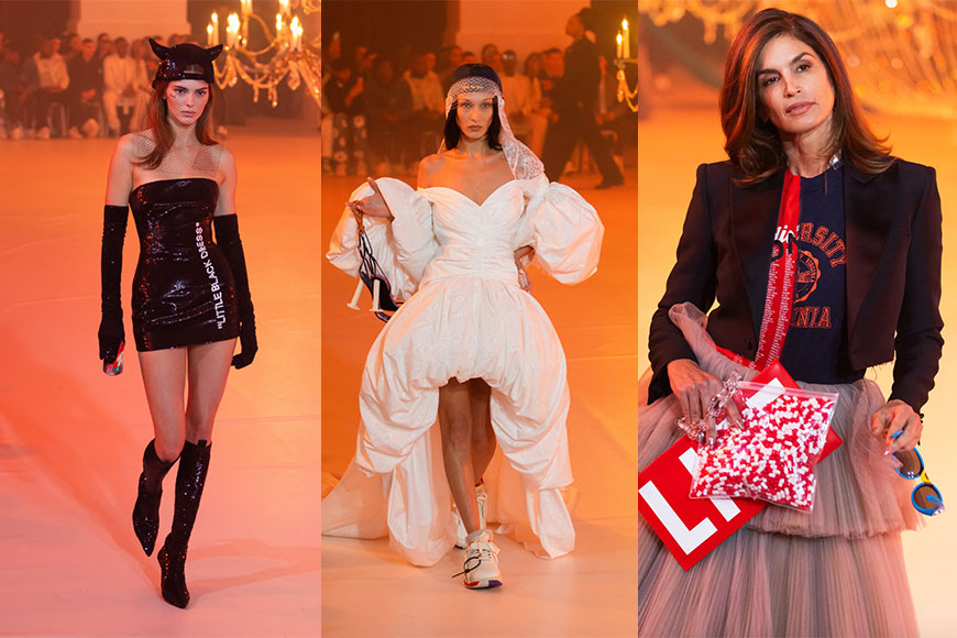 Kylie Jenner 穿上一條她本應在 2020 Met Gala穿著、印有 “Little Black Dress” 標語的小黑裙;向《Sex and the City》中 Carrie Bradshaw 致敬巨大的購物袋。而資深超模 Cindy Crawford 的兩個手提包中,亦似乎藏有一個嚴肅的信息,在一個印有「MORE LIFE」字樣、另一個則裝滿紅白色膠囊藥丸,讓人想起 Virgil Abloh 非常私密的抗癌過程。