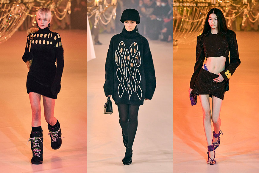 時裝騷不僅有 Off-White™ 2022 秋冬成衣系列,還包括由 Virgil Abloh 設計,並由品牌創意團隊完成的全新高級時裝系列。當中的女裝成衣系列,名為「Seeing Red」,靈感源自 90 年代科技元素、波希米亞風,以及次文化;一系列暗黑色系造型融合了滑雪運動單品與派對裝束,模特兒穿上鏤空針織、低腰褲裝、飾滿水晶的連身裙,以及民俗風印花長靴等,把看似衝突的三種風格元素放在一起,卻毫無違和感。