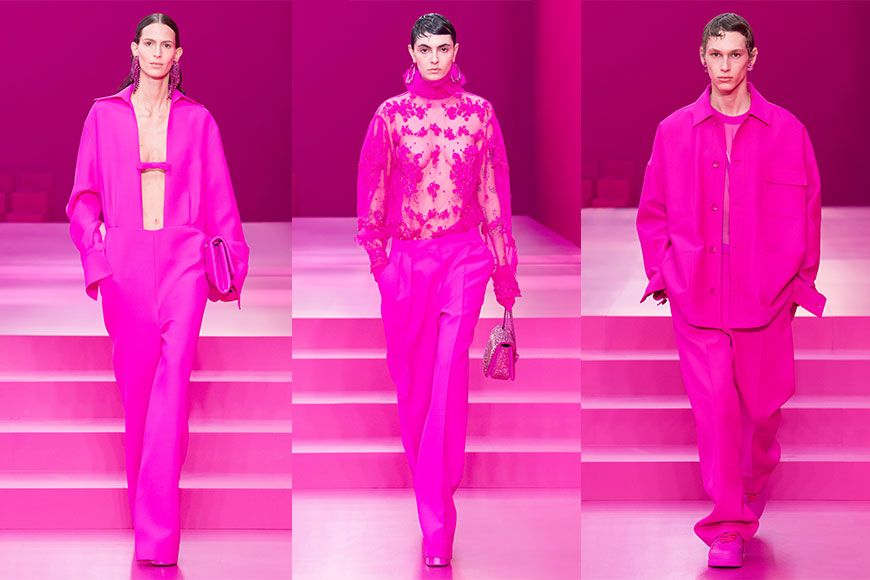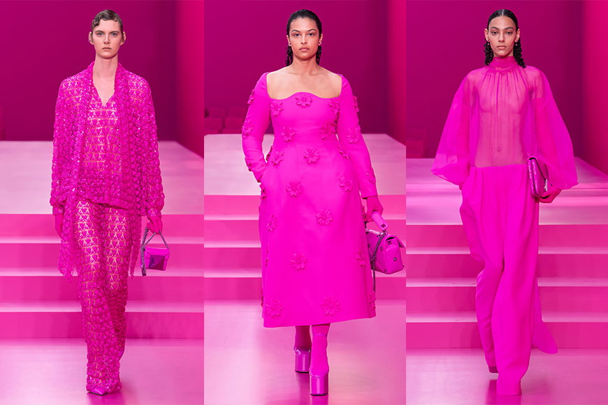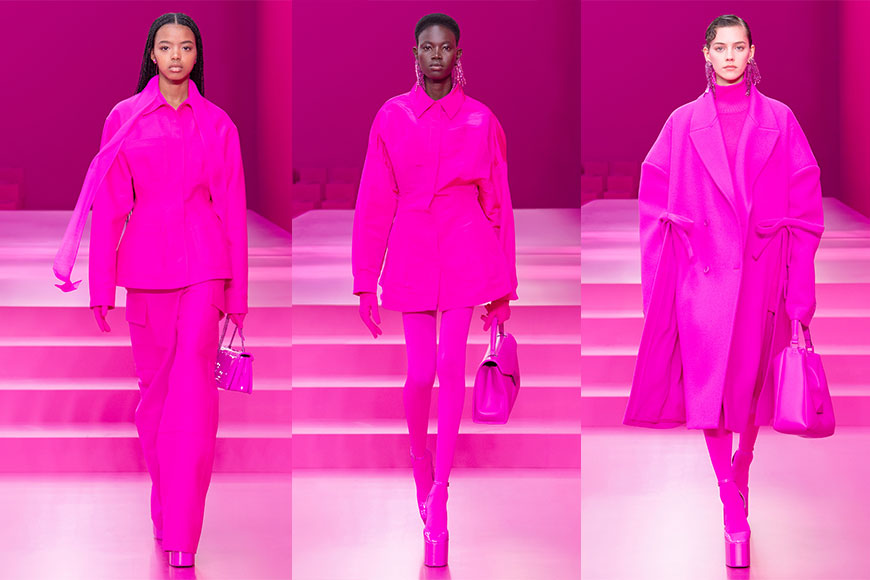 在 Valentino 2022 秋冬系列,創意總監 Pierpaolo Picciol 帶來了一場以單色調的實驗性創作,藉由粉紅色的不同面貌與特性,襯托出品牌製衣工藝的細膩。