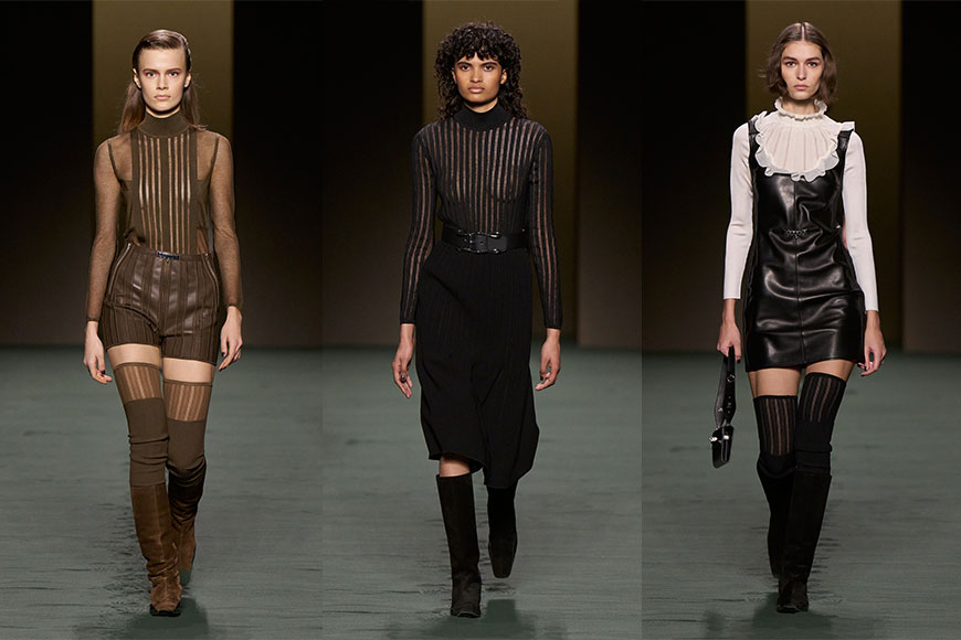 一如所料,在天橋上出現的是一系列剛柔並濟的服裝。甫開場,是俐落的黑色條紋皮革配搭迷你裙造型,當中運用小羊皮與真絲針織面料拼接,突顯出品牌的工藝核心。Nadège Vanhée-Cybulski 將大量的長方元素套用在皮革、針織,以及過膝長襪等不同的單品上,變化出幾何形的各種組合可能。