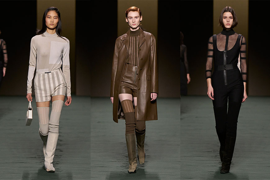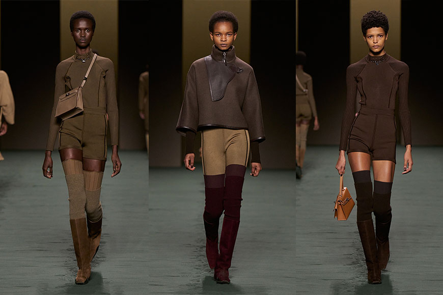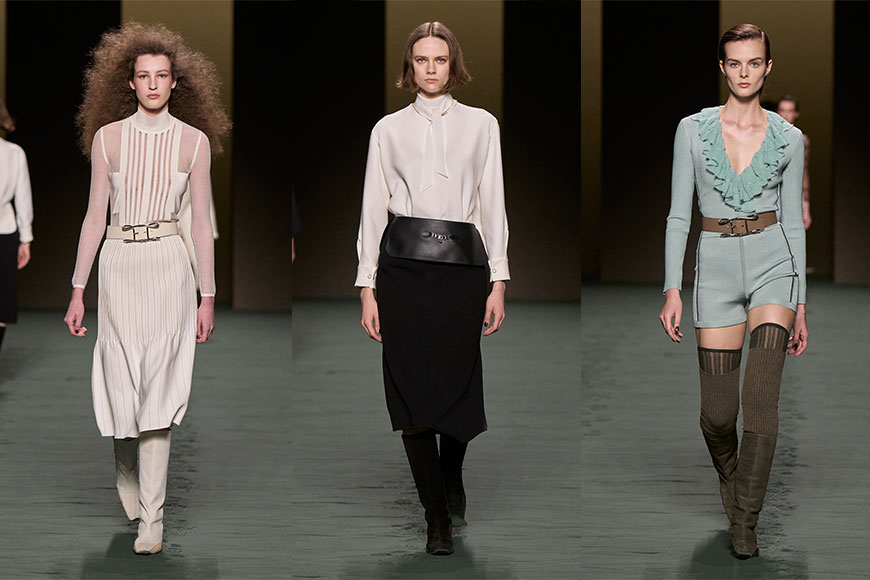除了品牌的經典馬術元素外,今季可見若隱若現的直紋透視貼膚針織衫、舒適合身的短褲;柔軟的皮革,配以浪漫輕柔的荷葉邊襯衣,給女性帶來極具質感的衣櫥。當中的膝上合身短裙、短褲造型,更是今季秋冬的主調,配搭貼身的過膝長襪和平底長靴,可見 Nadège Vanhee-Cybulski 非常懂得拿捏女人腿部的比例,巧妙延伸修長的線條,讓女性走起路來猶如芭蕾舞者,姿態優雅。