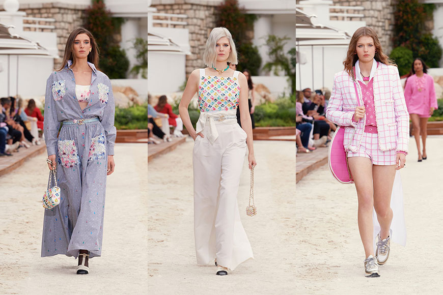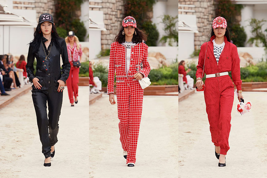 系列一共發布了共67個造型。Virginie Viard 將摩納哥標誌性的賽車、海灘等元素融入設計中。一開場,首先映入眼簾的是一系列是穿上 CHANEL 新裝的 F1 賽道女車手,從賽車服變化而來的連身褲被斜紋軟呢和 CHANEL 雙 C logo 賦予了時裝感,棒球帽和賽車頭盔上印上了 NO.5 的數字。